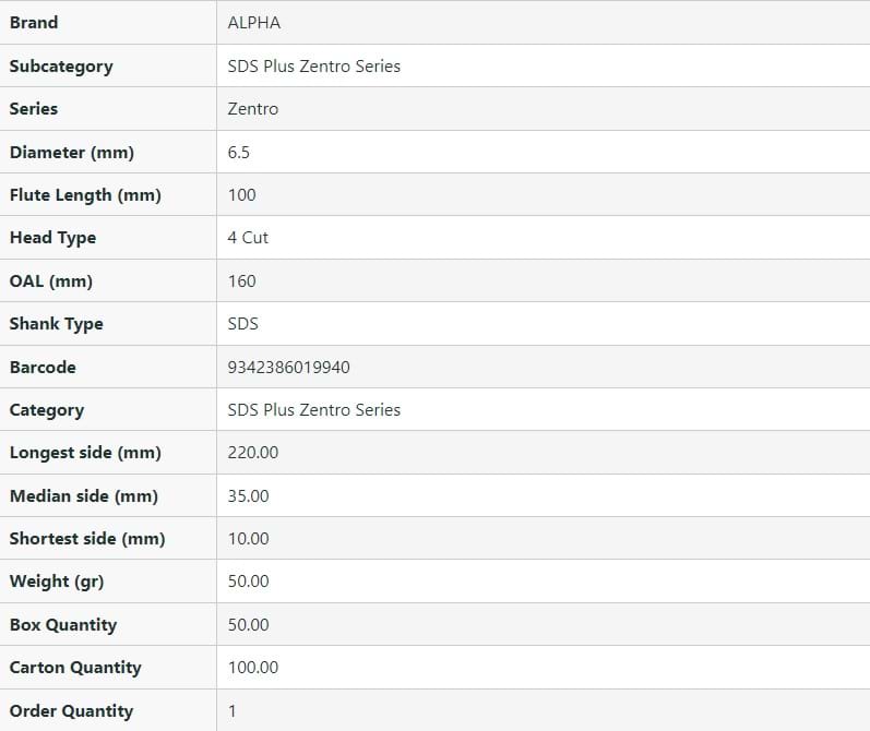 SDS Plus Zentro 4-Cutter Masonry Drill Bit - 6.5mm OAL.160mm FL.100m